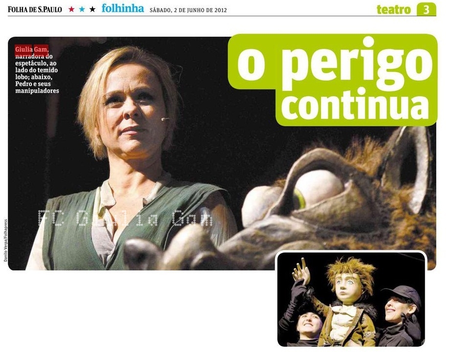 Traz a história de um menino que mora perto da floresta, onde o perigo tem nome de lobo. Desobedecendo o avô, Pedro sai com os amigos – a pata, o passarinho e o gato – para enfrentar a fera. Essas peripécias são narradas pela atriz Giulia Gam, que divide o palco com bonecos de vários tipos e tamanhos. Criados por Marcos Lima, eles “falam” por meio de instrumentos. Pedro é representado por um violino, o lobo anda sob o som da trompa, flautas lembram os passarinhos.